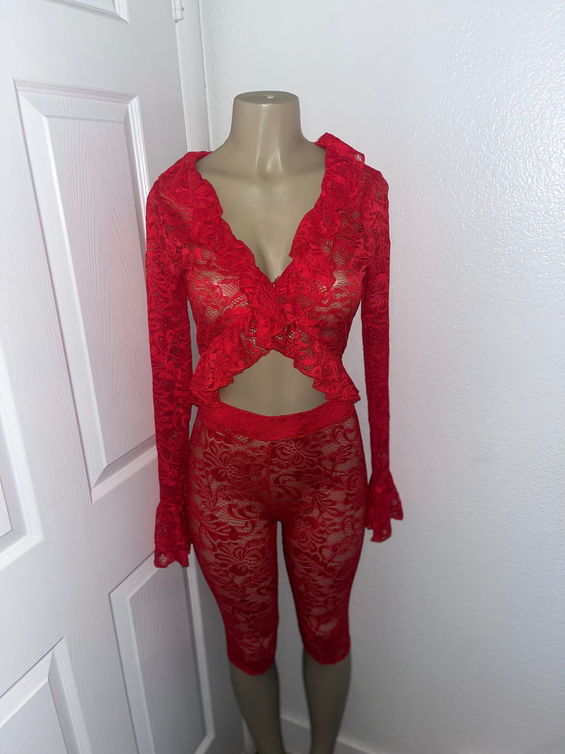 Lace capri leggings with lace top open front with flare wrist on shirt